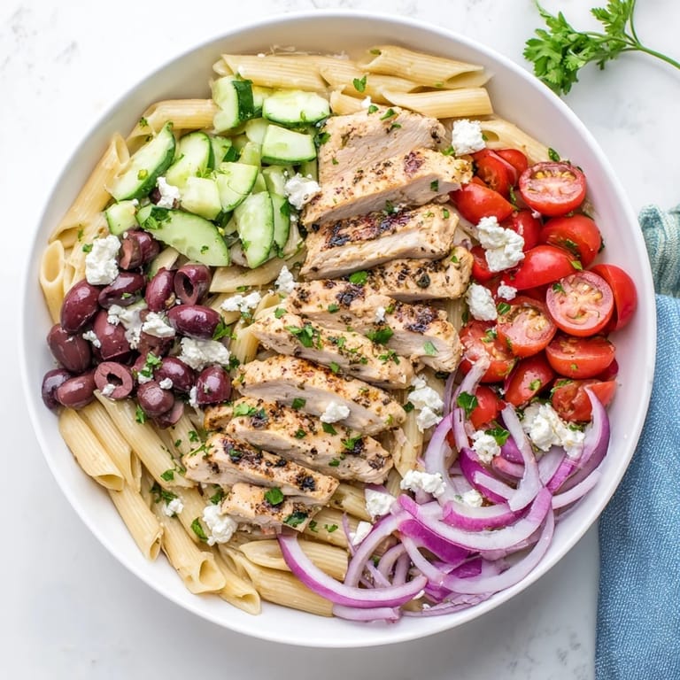 Pin It The first time I made this Greek chicken pasta, I was attempting to recreate a vacation dinner from a tiny taverna in Santorini where the owner kept bringing out more dishes than we could possibly eat. The combination of bright lemon, salty feta, and fresh vegetables captured everything I loved about Mediterranean cooking without requiring hours at the stove.